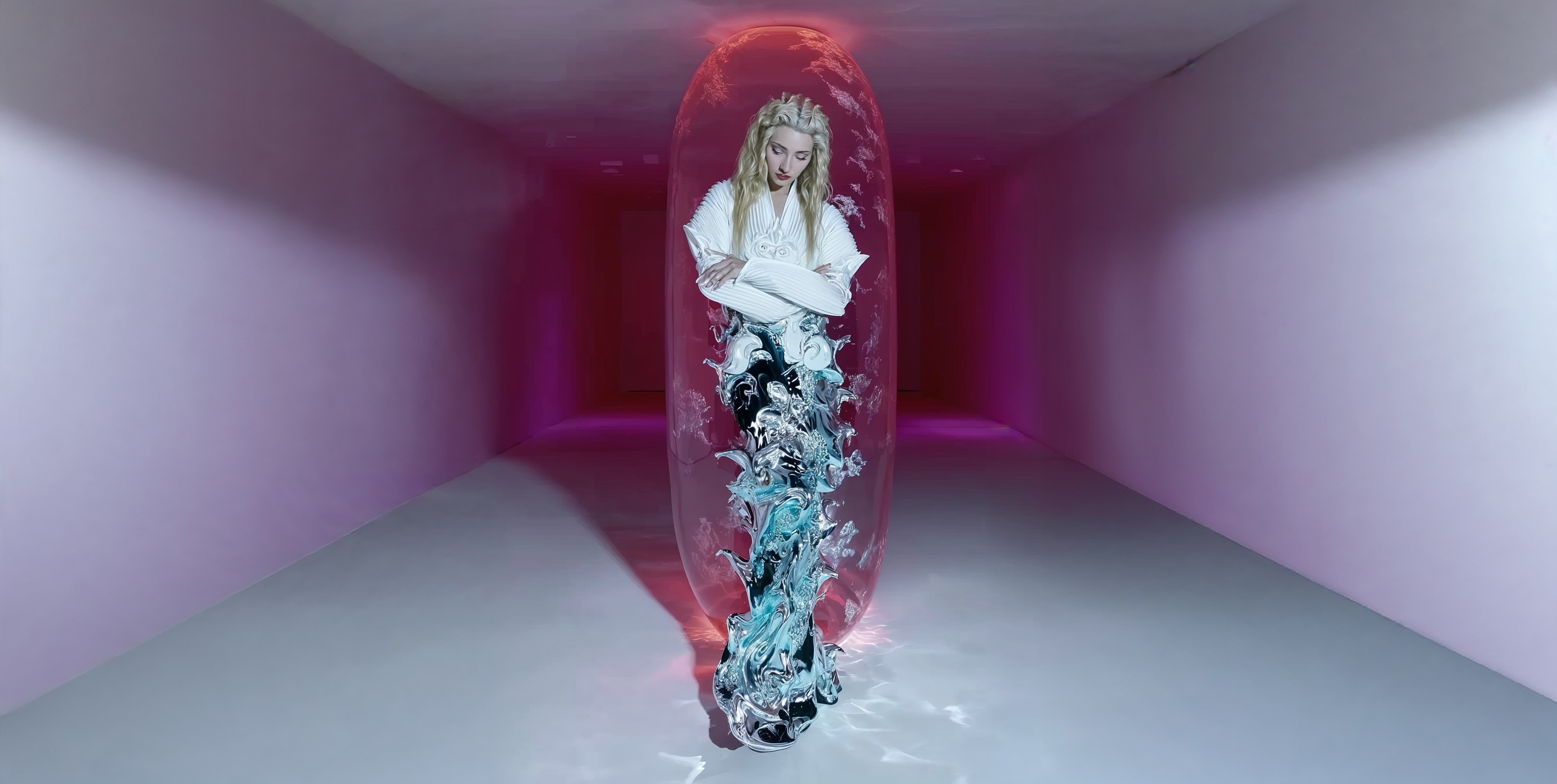 Through luminous color fields, hybrid figures, and speculative iconography, the work positions AI as an active agent—one that reshapes authorship and the way meaning is sensed rather than rationally decoded. Interactivity is treated as a threshold: the system does not reward noise or spectacle, but coherence, stillness, and attention.